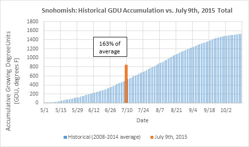 We utilized data what we called historical data for the time period of 2008 to 20014, and compared that to data through July 9th of 2015. The data shown in figures 1, 2, and 3 show that the accumulative GDU by July 9 of this year was at 163%, 165%, and 157% of the 2008 to 2014 average for Snohomish, Lynden, and Sunnyside, respectively.