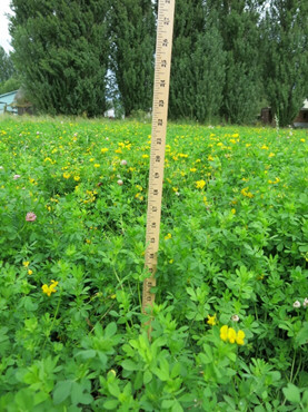 Demonstration plantings (100% BFT and 50% BFT – 50% Timothy) in September 2014 were underwater in January 2015 (Photo 1, with annual ryegrass weed incursion), but ready for a first cutting in April. This apparent tolerance to waterlogged soil is a definite advantage for western WA production. BFT was seeded at 20# per acre and 1/4″ deep. Pre-planting fertilizer and BFT-specific inoculum were included. Five cuttings were made that year with production averaging 4.5 tons/acre. Results of the fresh forage chemical analysis on the 8/19/15 are included in Table 1.