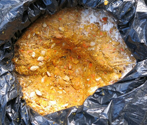 Photo 5. Pumpkins and straw ensiled 100 days. Pumpkins were ensiled in five-gallon buckets with and without straw last fall (Photo 5). Straw was included as a variable in the study to see if and how pumpkins could help upgrade the nutritional value of this low-value fiber source (straw) while expanding the volume of pumpkin silage, without excessive dilution of the nutritional value of pumpkins. Chemical analysis results are in Table 2. Palatability factors are unknown because the microbial content of this ensiled material could not be guaranteed as safe so it was not fed to livestock.
