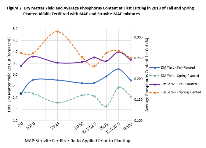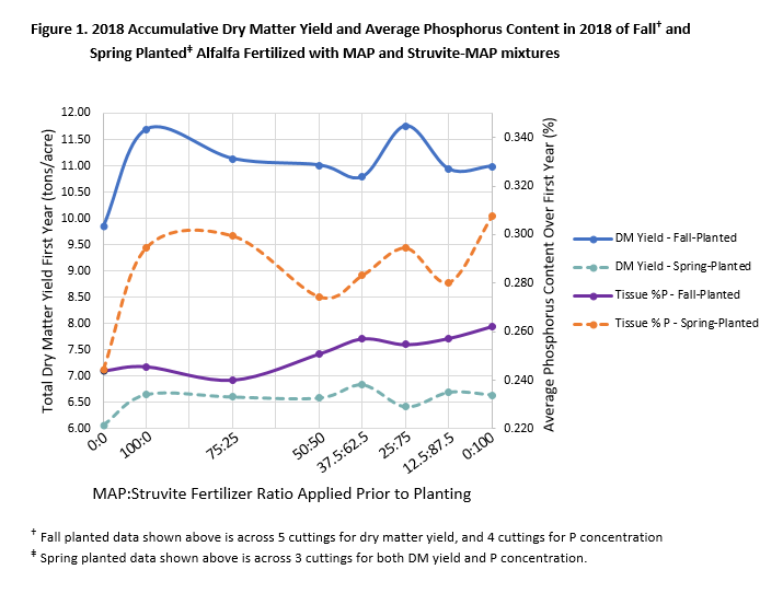 Two simultaneous plot studies (< 1 acre each) were conducted by Dr. Norberg in Prosser to compare agronomic performance of different combinations of Struvite and MAP mixtures on fall and spring planted alfalfa. Plots were randomly fertilized at a constant rate with one of 7 different mixtures of MAP:Struvite (100:0, 75:25, 50:50, 37.5:62.5, 25:75, 12.5: 87.5, 0:100) just before planting, or left as an unfertilized check. The fall-planted alfalfa was cut 5 times in 2018, while spring-planted was only cut 3 times. The source of P, whether MAP or Struvite, did not have a significant effect on yield or P uptake in the first cutting and season-wide, regardless of planting time (Figures 1 and 2).