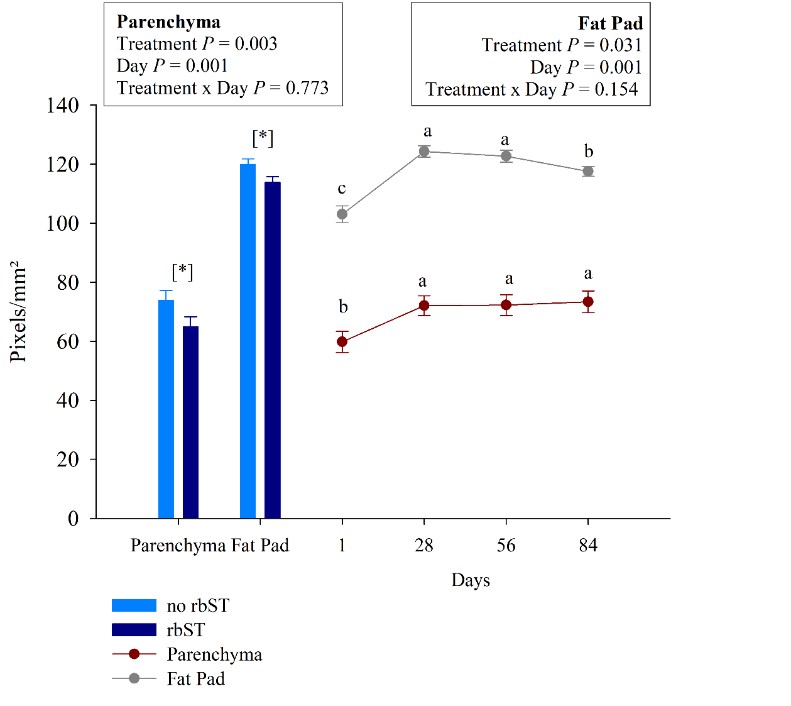 For carcass, rbST heifers presented a 25% increase in lean tissue deposition (Figure 1). In addition, we observed an increase in parenchymal tissue for the mammary gland and a reduction in fat pad tissue for rbST heifers (Figure 2). It may seem different at first look, but we aim to reduce pixel values for parenchyma and fat pad when evaluating mammary gland ultrasound results. The explanation is simple. In ultrasound, darker areas – lower pixel – represent structural or secretory tissues, as the parenchyma. On the other side, brighter areas – higher pixel – represent reservoirs tissues, as the adipose tissue. Thus, the reduced pixel value found for parenchyma represents greater secretory tissue deposition, and the reduced pixel value seen for the fat pad represents reduced adipose tissue deposition in the gland. If you still have questions about this analysis, check the companion paper written by Albino et al. (2017b) and learn more about this technique.