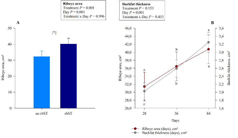 Figure 1. Representation of carcass ultrasound results. A – Carcass ribeye area between treatments. B – Carcass ribeye area and backfat thickness among days. Differences were considered when P – the value was ≤ 0.05. Adapted from Sguizzato et al., (2022).